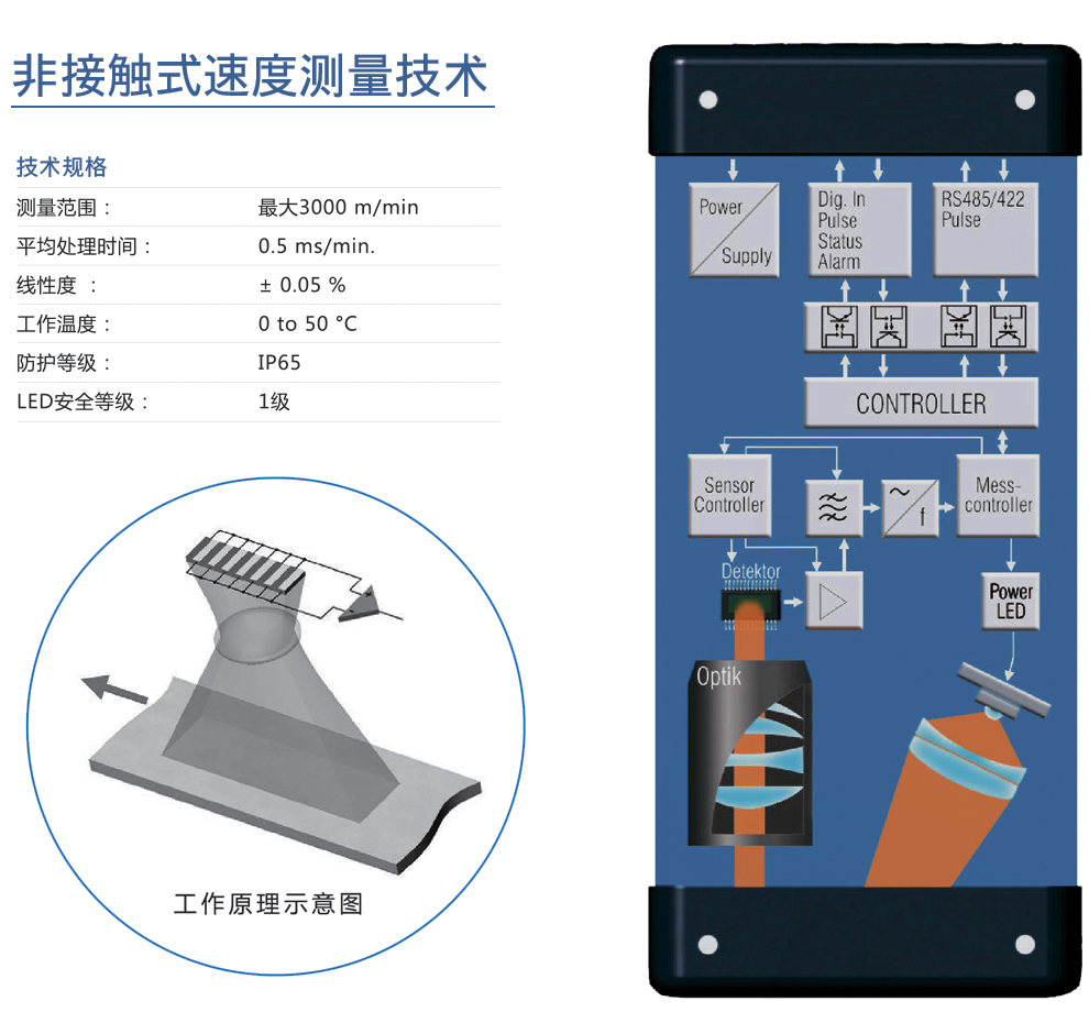 ASCOspeed測速儀采用LED作為照射光源,因而操作十分安全,對操作人員無潛在危險,同時,LED光源的光束直徑要比現(xiàn)有以激光多普勒測量原理的激光測速儀的光束直徑大100倍,因此對環(huán)境的適應性更強,粉塵顆粒及油霧對其工作影響較小,因而工作更為可靠穩(wěn)定。