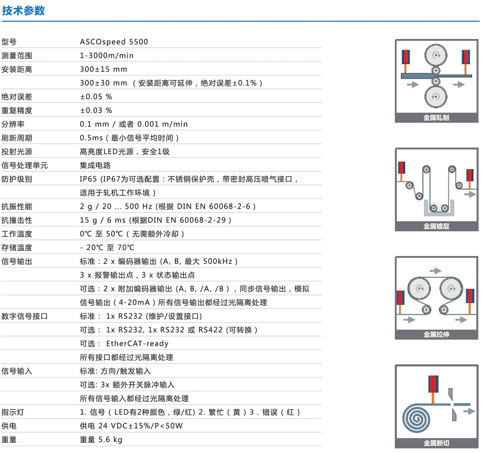 ASCOspeed系列光學測速儀是一款專門針對金屬材料速度和長度的測量系統(tǒng),適合用于治金、有色金屬加工行業(yè)各類軋機平整機、金屬處理線等設備。              ASCOspeed測速儀最大優(yōu)點是對材料表面特性不敏感,即使是對鋁、銅、不銹鋼等高光澤或反光表面金屬也能勝任測量要求。